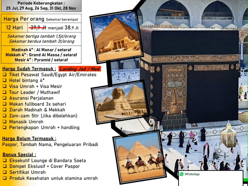 - Hotel Madinah 3 Malam, Mekkah 4 Malam dan Cairo 2 malam